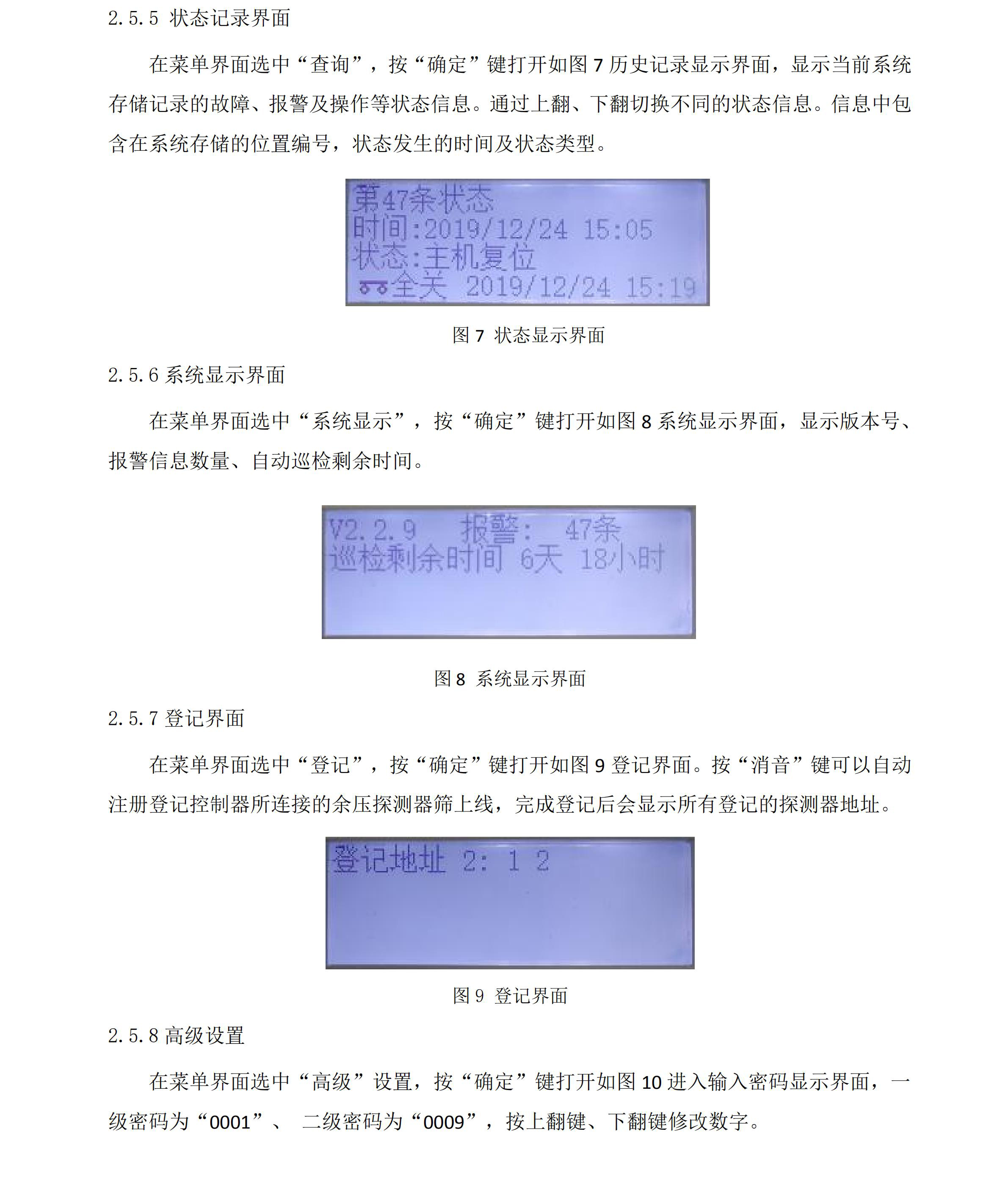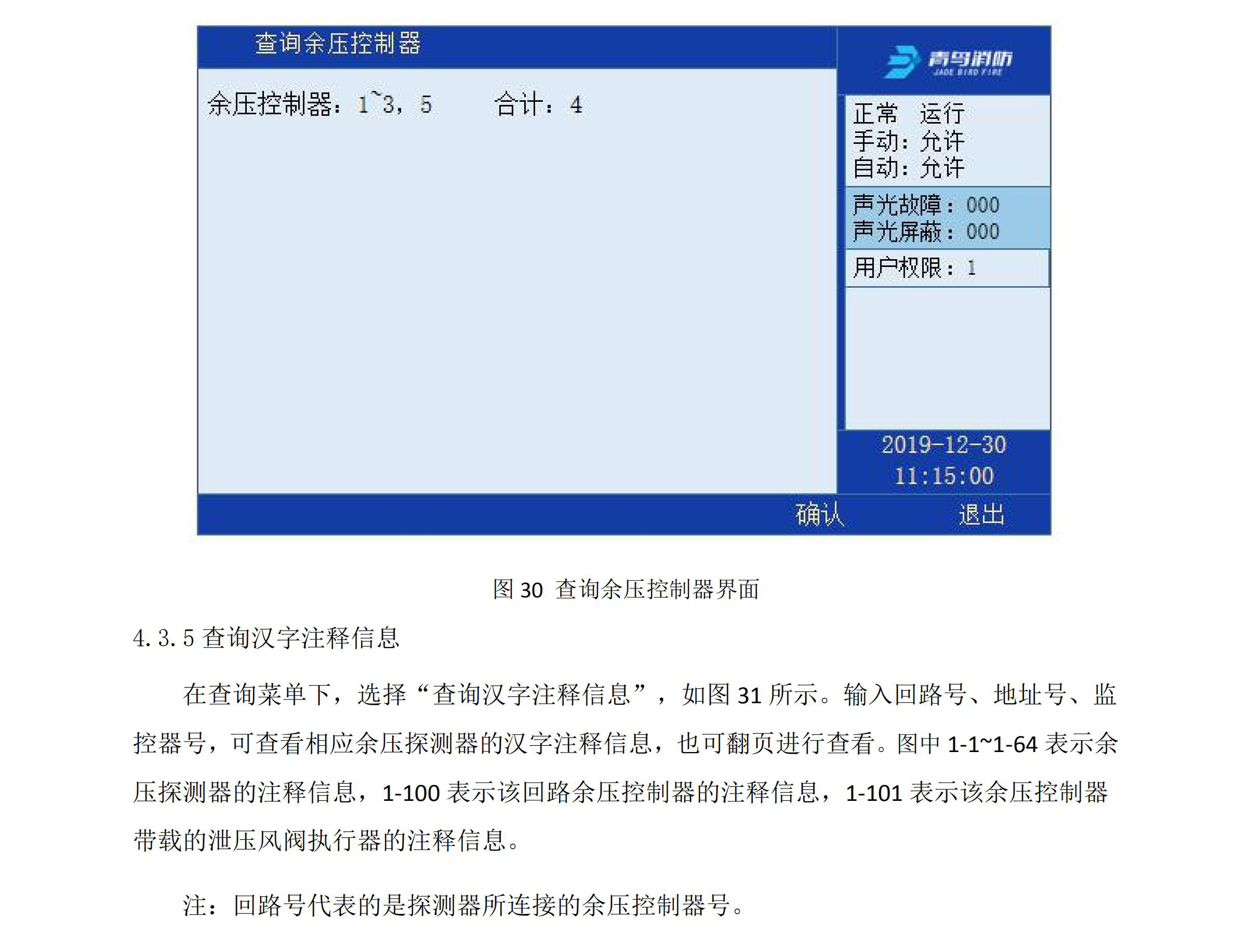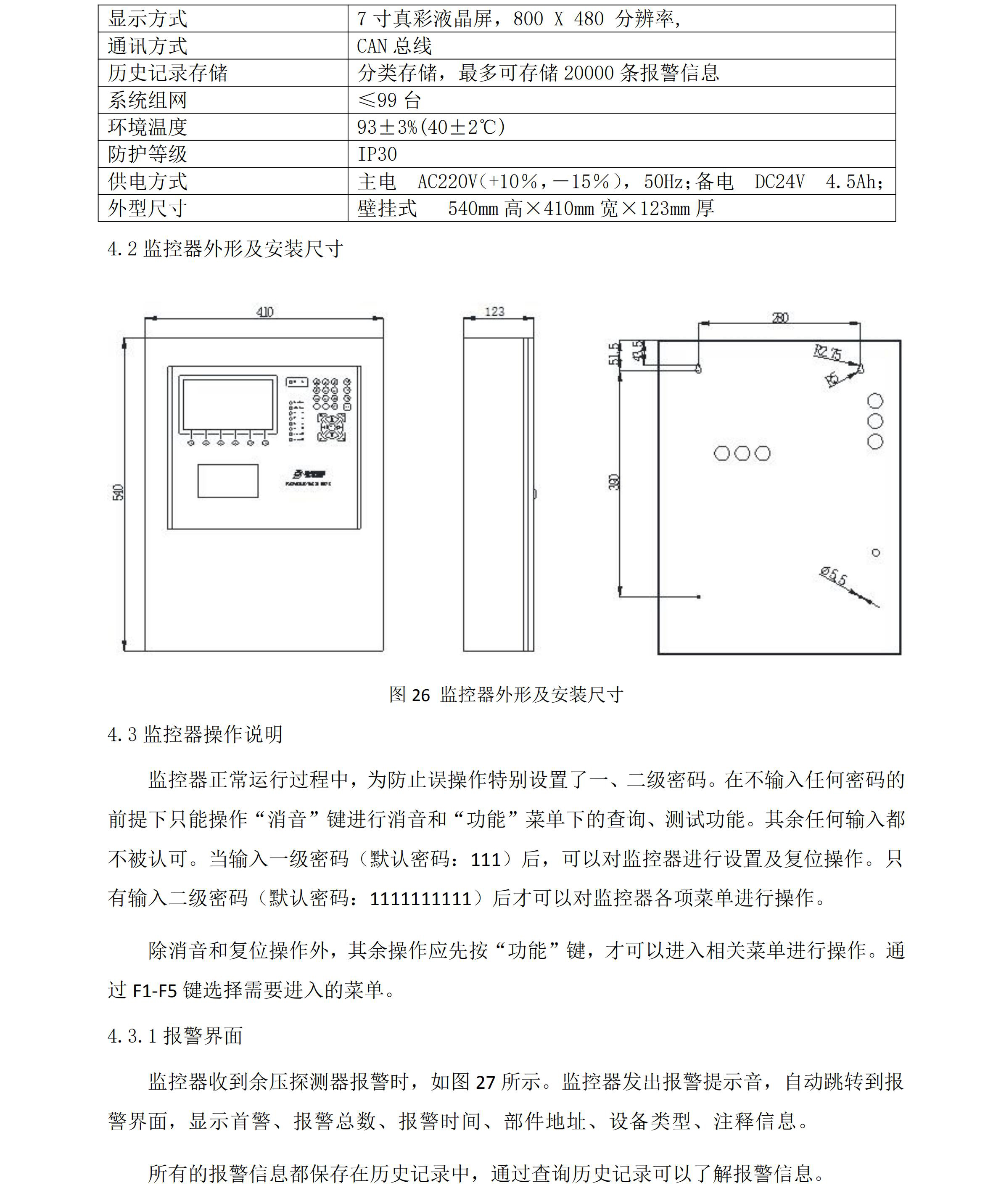 -控制器接收來(lái)自探測(cè)器的余壓報(bào)警信號(hào),在 10s 內(nèi)發(fā)出聲、光報(bào)警信號(hào),顯示報(bào)警探測(cè)器的地址,記錄報(bào)警時(shí)間。