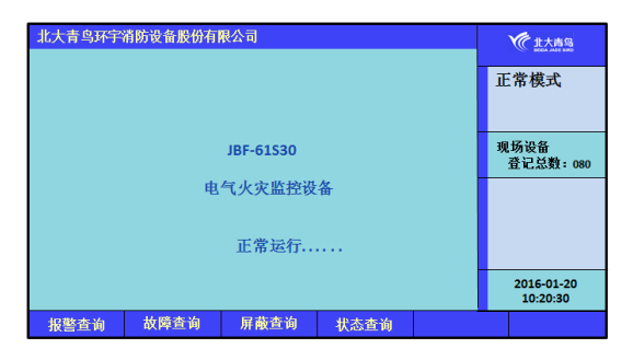 正常監(jiān)視狀態(tài)無任何聲響;“主電運行”燈閃亮,其余所有燈不亮;顯示當前時間;顯示現(xiàn)場設備登記總數(shù);液晶屏在正常監(jiān)視狀態(tài)下運行5分鐘后,若無任何操作和報警,將進入屏幕保護狀態(tài)(黑屏)。按下任一鍵后, 可重新點亮屏幕。監(jiān)視狀態(tài)如圖6.1所示。