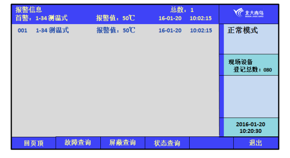 測溫式探測器的報警信息,首警將置于顯示屏最上方,顯示報警時的剩余電流值或溫度值,顯示報警地址、時間及報警總數(shù)。監(jiān)控設備收到報警信號發(fā)后,界面顯示信息如下圖6.2所示。
