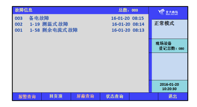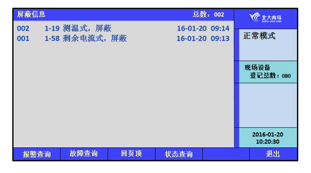 當系統(tǒng)中有現(xiàn)場部件發(fā)生故障,不能正常工作時,為了不對整個系統(tǒng)造成影響,需要將故障部件屏蔽。在進行屏蔽操作后,該故障部件顯示被屏蔽,監(jiān)控設備復位后該部位不再報故障。當系統(tǒng)內(nèi)存在部件被屏蔽時,面板屏蔽指示燈長亮,進入查詢菜單可以查詢到被屏蔽的部位號及屏蔽部位總數(shù)。