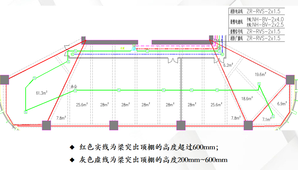 當突出頂棚的高度超過 600mm時被梁隔斷的每個梁間區(qū)域應至少設置一只探測器;