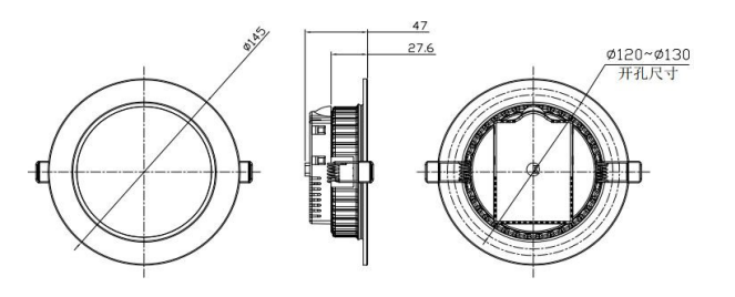 在圖紙設計位置,按照圖示建議開孔尺寸開孔,按照上圖接線方法接線,將兩彈簧卡扳向燈具尾部出線方向,將燈具尾部塞入安裝孔,確保燈具牢固美觀。