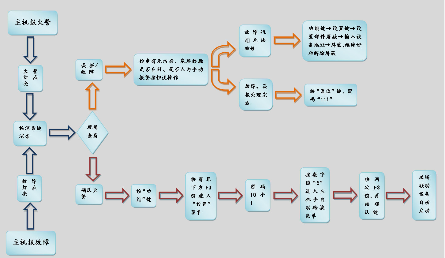 北大青鳥(niǎo)消防設(shè)備火災(zāi)報(bào)警主機(jī)主動(dòng)報(bào)警時(shí):火警燈點(diǎn)亮,確認(rèn)火警后按照步驟圖操作。