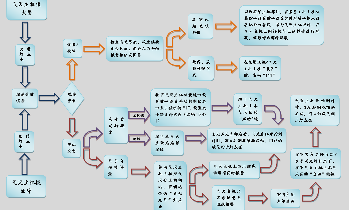 若主機(jī)無(wú)手自動(dòng)轉(zhuǎn)換盒,轉(zhuǎn)動(dòng)氣滅主機(jī)上相應(yīng)氣滅分區(qū)的鑰匙,將鑰匙旁的“自動(dòng)允許”燈點(diǎn)亮,按下緊急啟停按鈕/在手動(dòng)允許狀態(tài)下,按下氣滅主機(jī)上本氣滅區(qū)的“啟動(dòng)”按鈕,氣滅主機(jī)開始倒計(jì)時(shí),30s后鋼瓶噴灑啟動(dòng),門口的放氣指示燈點(diǎn)亮