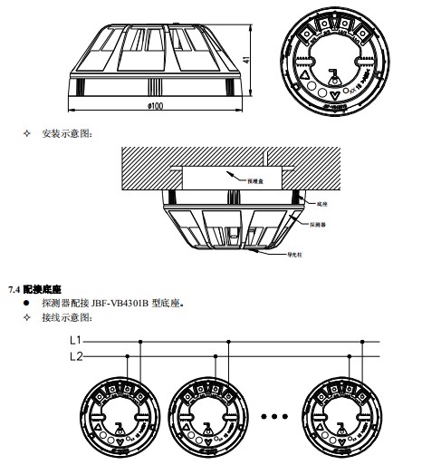 端子LI、L2分別接信號線L1和L2,無極性,信號線采用ZR-RVS-2Xl^mm2雙絞線?將探測器嵌入底座,按順時針方向擰緊即可。?