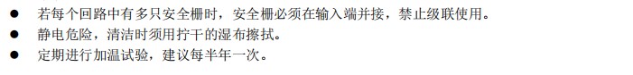 ?•使用時(shí)必須配接安全柵,每只安全柵后所帶防爆型感溫探測(cè)器《10只,每個(gè)報(bào)警回路使用安全柵?的數(shù)量不得超過6只。