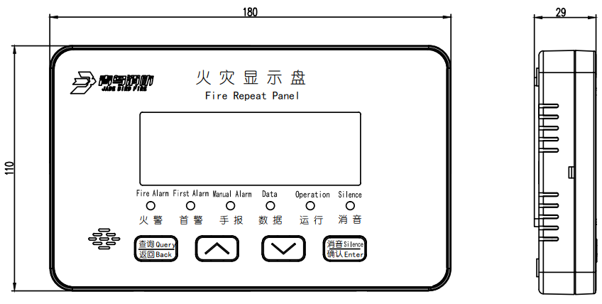 確 認(rèn) 燈 | 火警(紅色)、首警(紅色)、手報(bào)(紅色)、數(shù)據(jù)(紅色)、運(yùn)行(綠色)、消音(紅色) |
