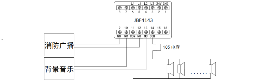 (2)如采用非消防專用揚聲器,則需在每只JBF4143模塊的輸出端任一腳串接1只105μF獨石電容(400V耐壓)。