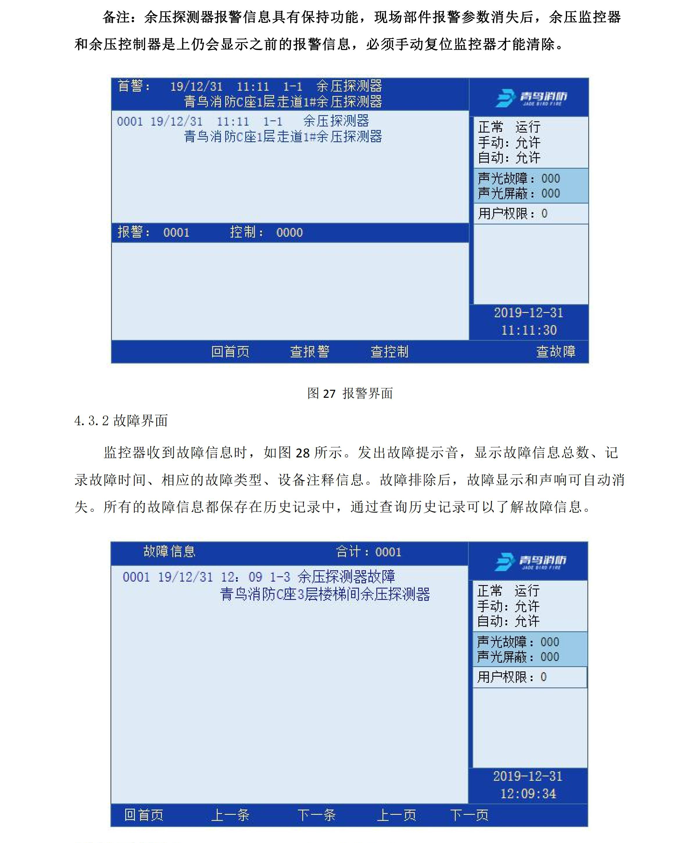 -控制器接收來(lái)自探測(cè)器的余壓報(bào)警信號(hào),在 10s 內(nèi)發(fā)出聲、光報(bào)警信號(hào),顯示報(bào)警探測(cè)器的地址,記錄報(bào)警時(shí)間。