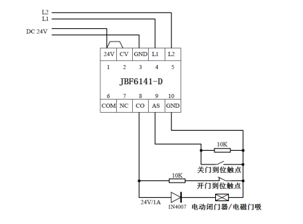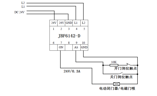 l AS(端子9)、GND(端子10)連接電動(dòng)閉門器等設(shè)備的關(guān)門到位信號(hào)(無源觸點(diǎn));